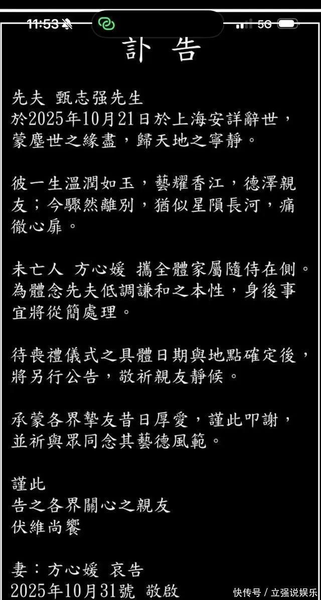 一代荧幕经典陨落了,香港演员甄志強,才59岁啊,2025年10月21日,在上海,突然就走了,这消息震惊娱乐圈,真的,大家都没想到,家属发了声明,是太太方心媛,她公布的死讯,表达了对丈夫的思念,丧事一切从简,细节以后再说吧。怎么就走了呢,猝逝的原因,大家都在猜,港媒说,可能是心脏问题,打球运动会不会也有关系,球会,陈展鹏证实了,甄志強在球会安详离世,但具体情况,他们家属没说,今年5月,他好像生病住院手术了,身体可能一直不太好,这个也说不准啊。